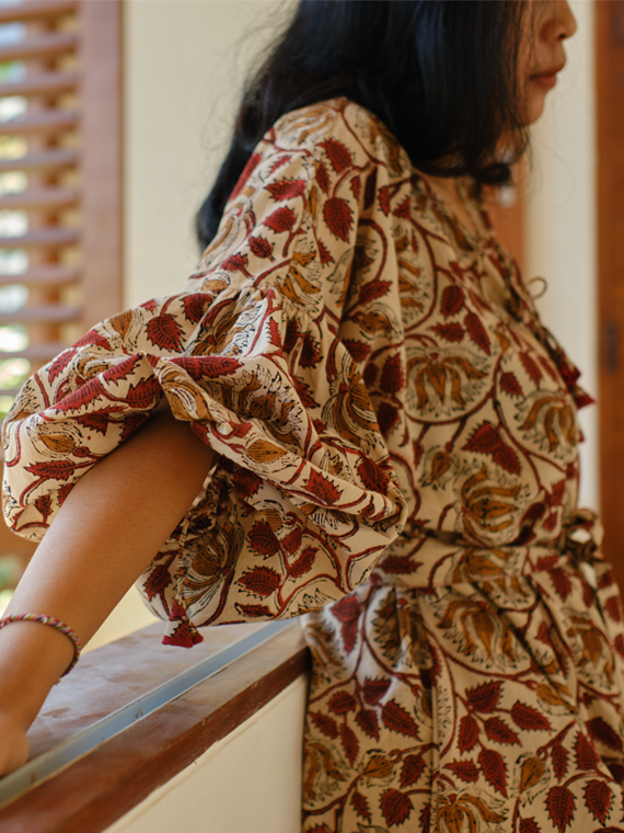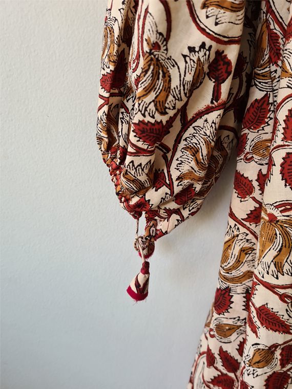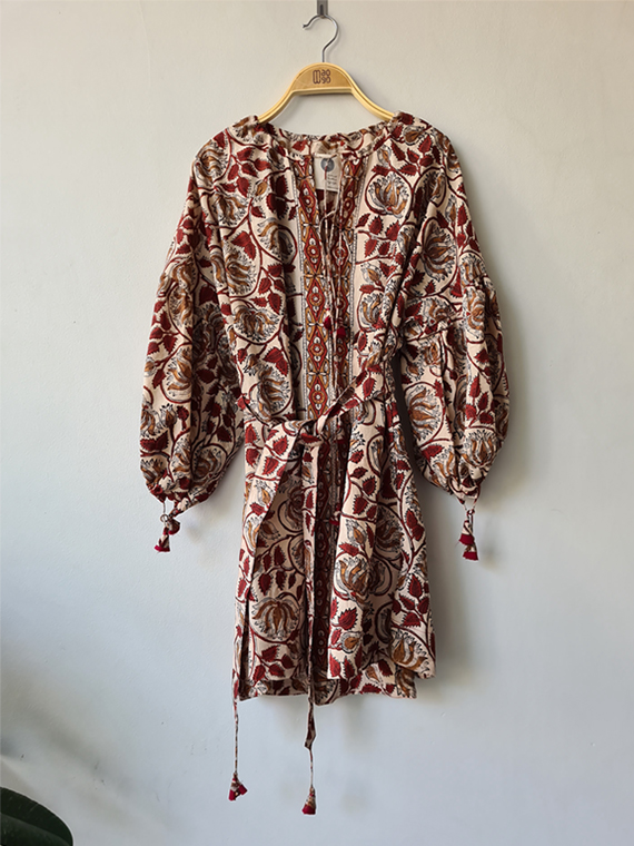 One piece dress with a matching mask Side length 77 cm Front length 84 cm Bust up to 132 cm Arm hole up to 19 cm Material : Hand Block Printed Cotton (Handprint) with floral pattern. The hand stamping method makes each piece of the pattern unmatched and makes it unique.