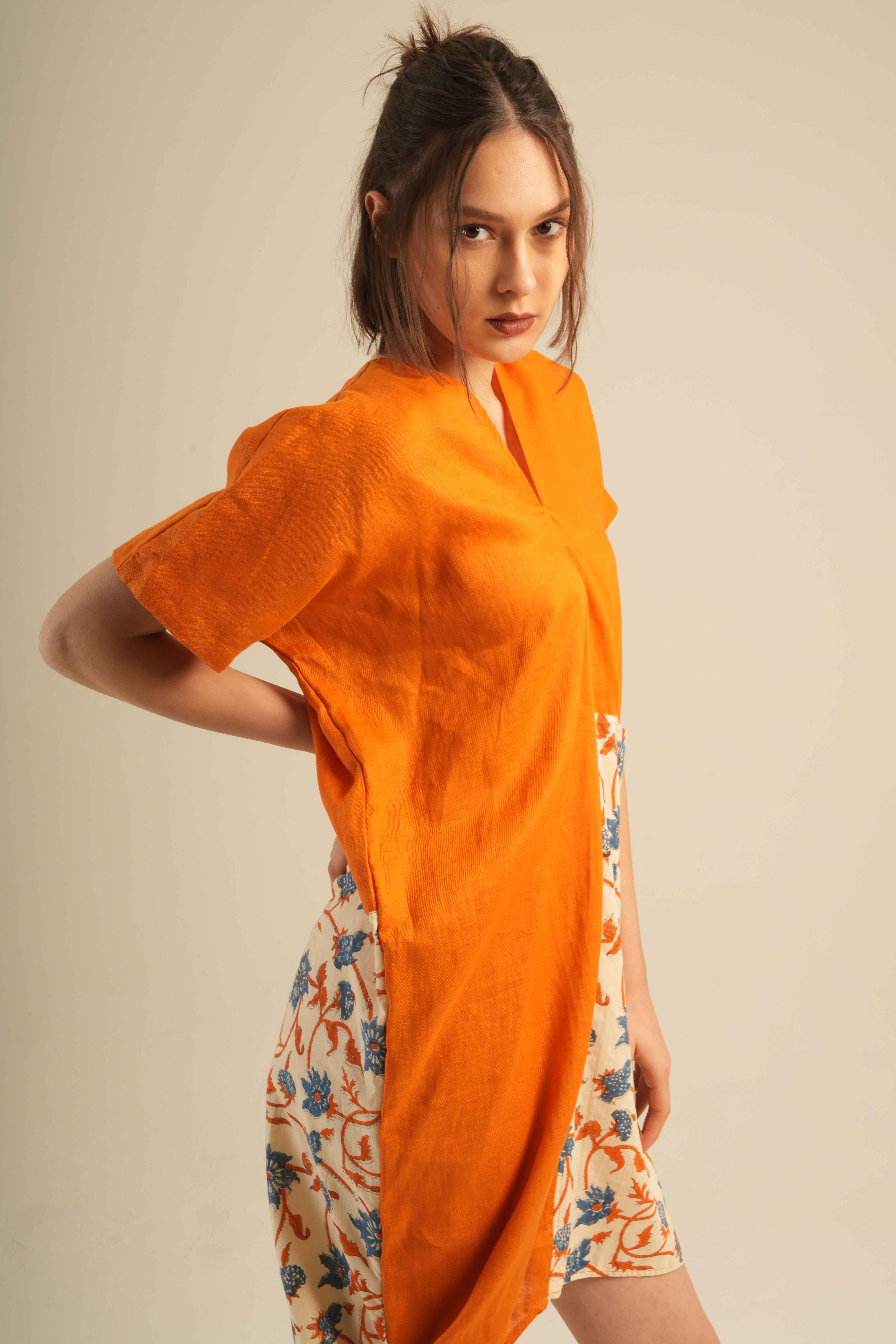 Jai Blouse unique,asymmetrical blouse crafted from 100% high-quality linen and adorned with traditional hand block prints. Designed for comfort with an artistic and elegant touch.