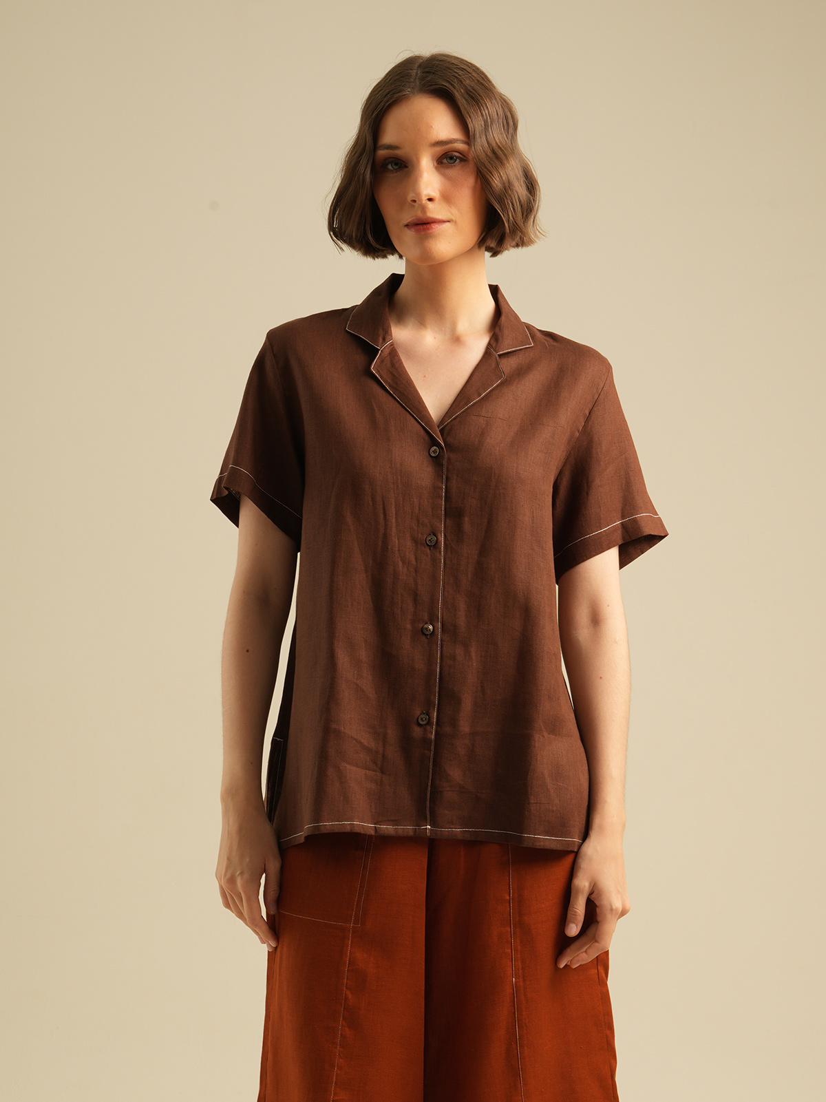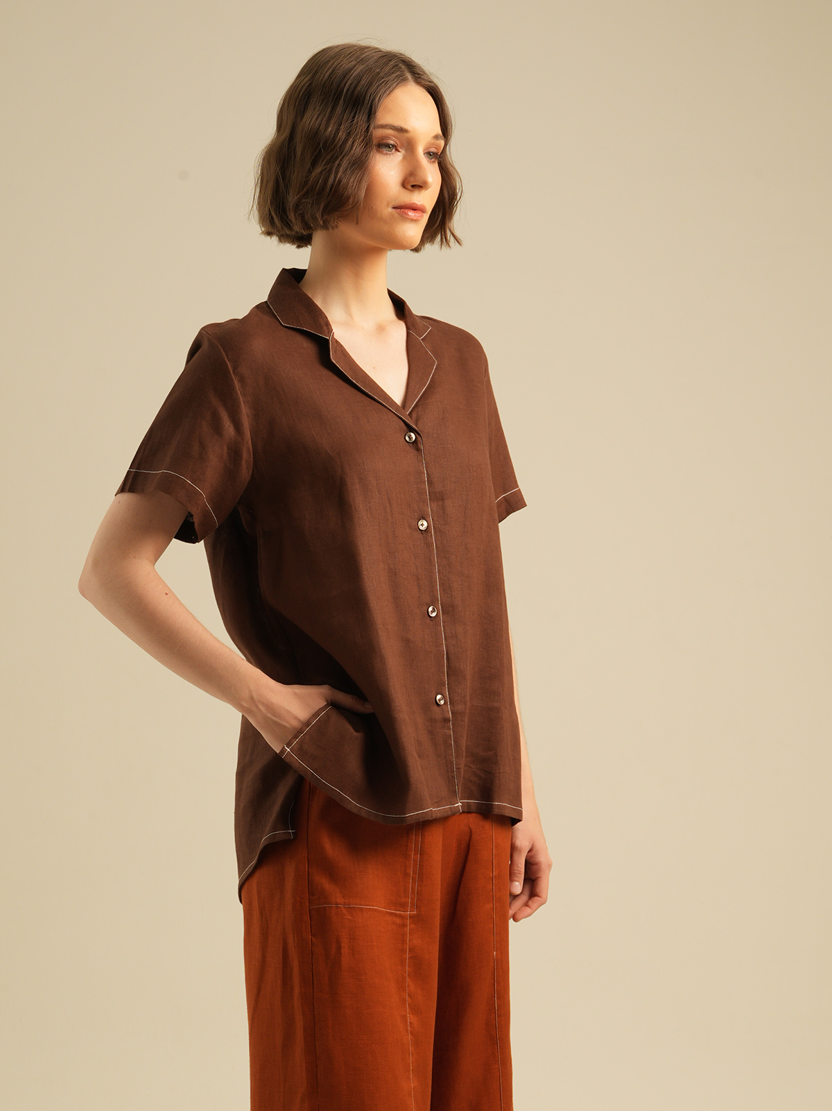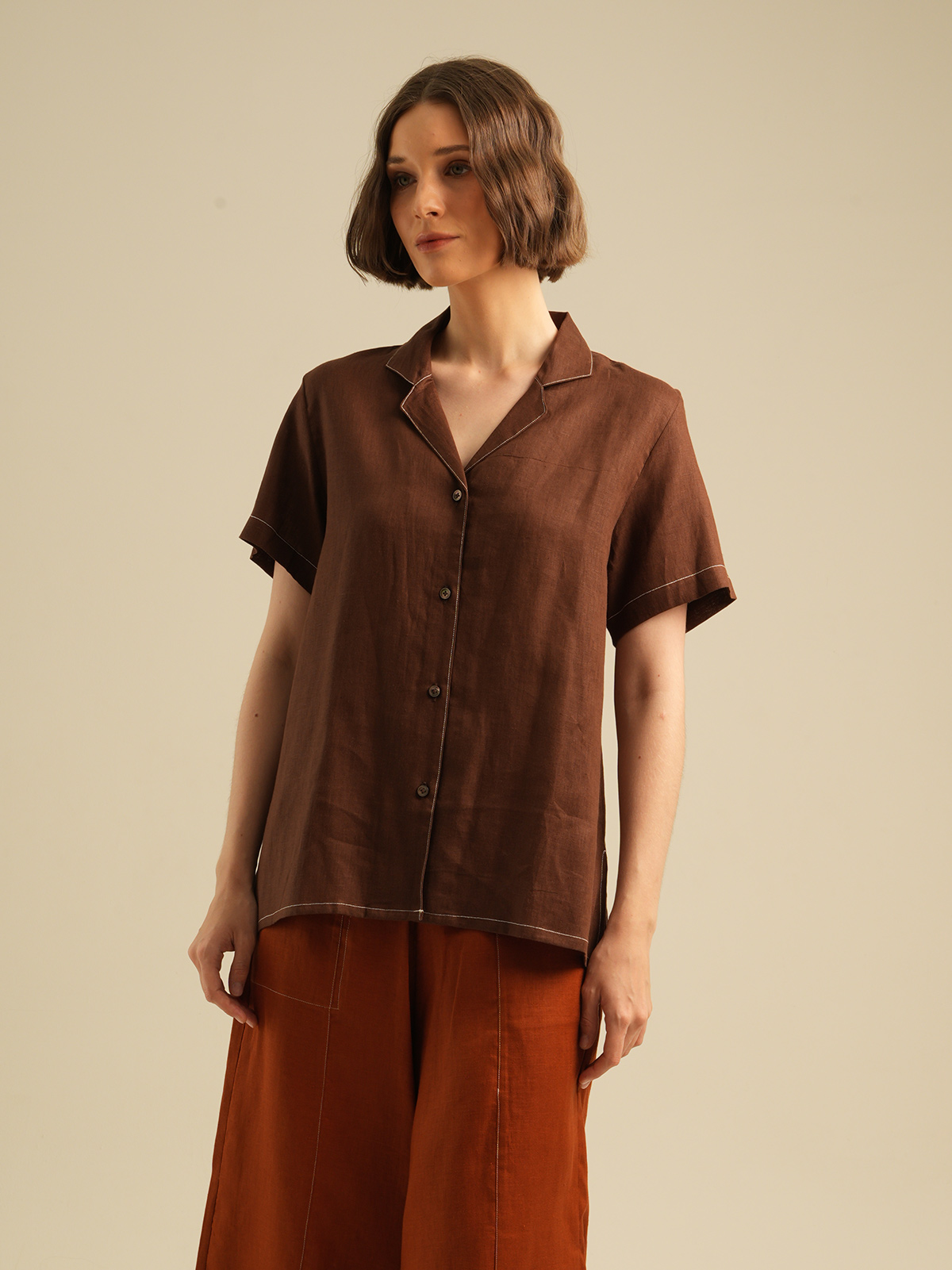 Relaxed Short Sleeves Shirt with Detailed Stitches. Made of 100% Premium Linen