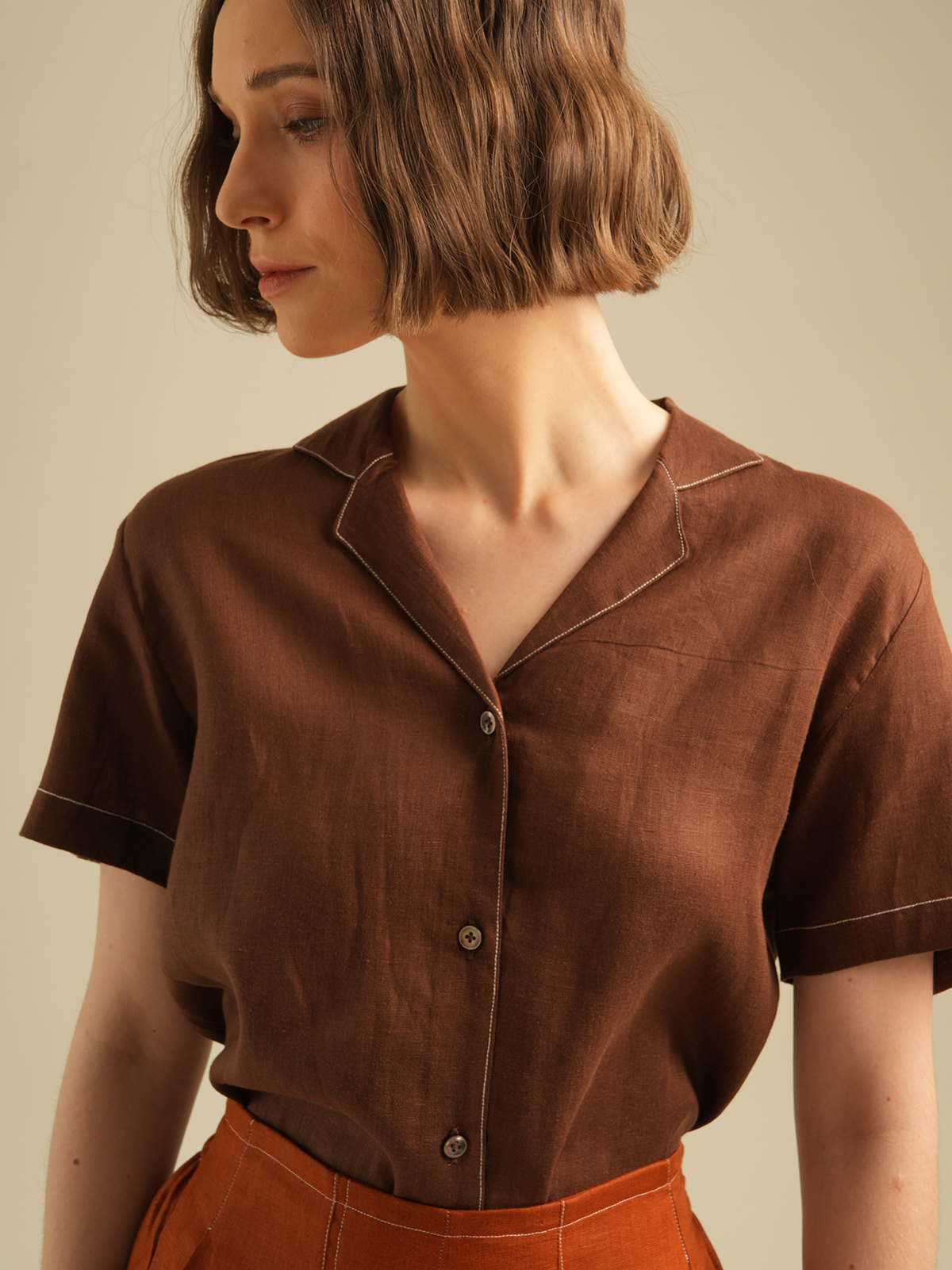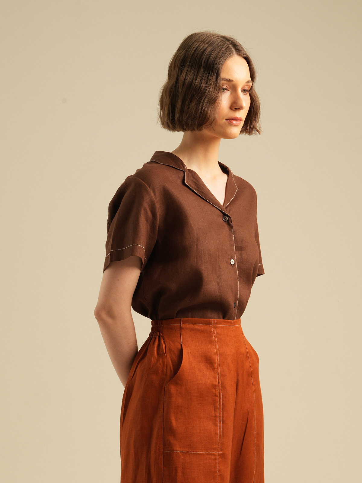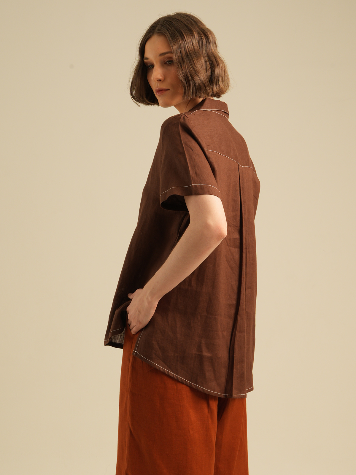 Relaxed Short Sleeves Shirt with Detailed Stitches. Made of 100% Premium Linen