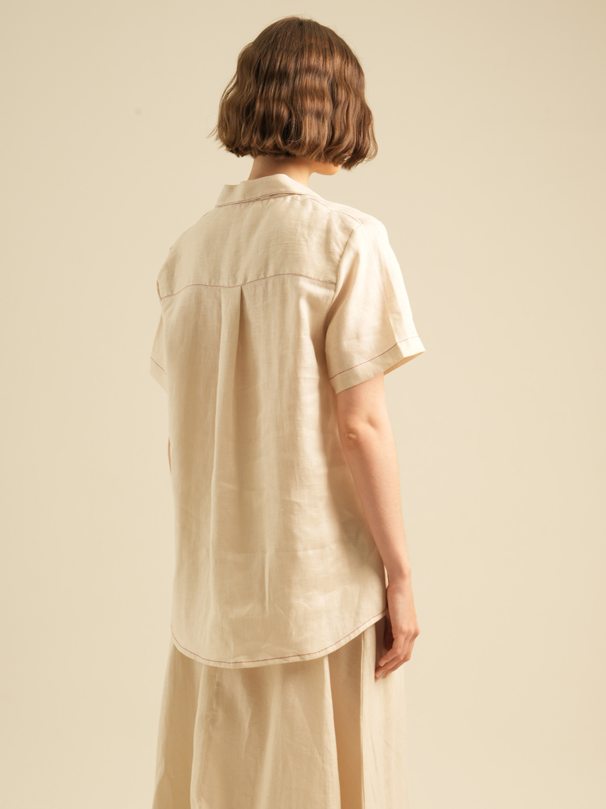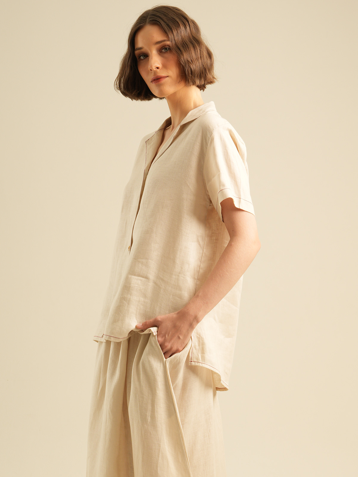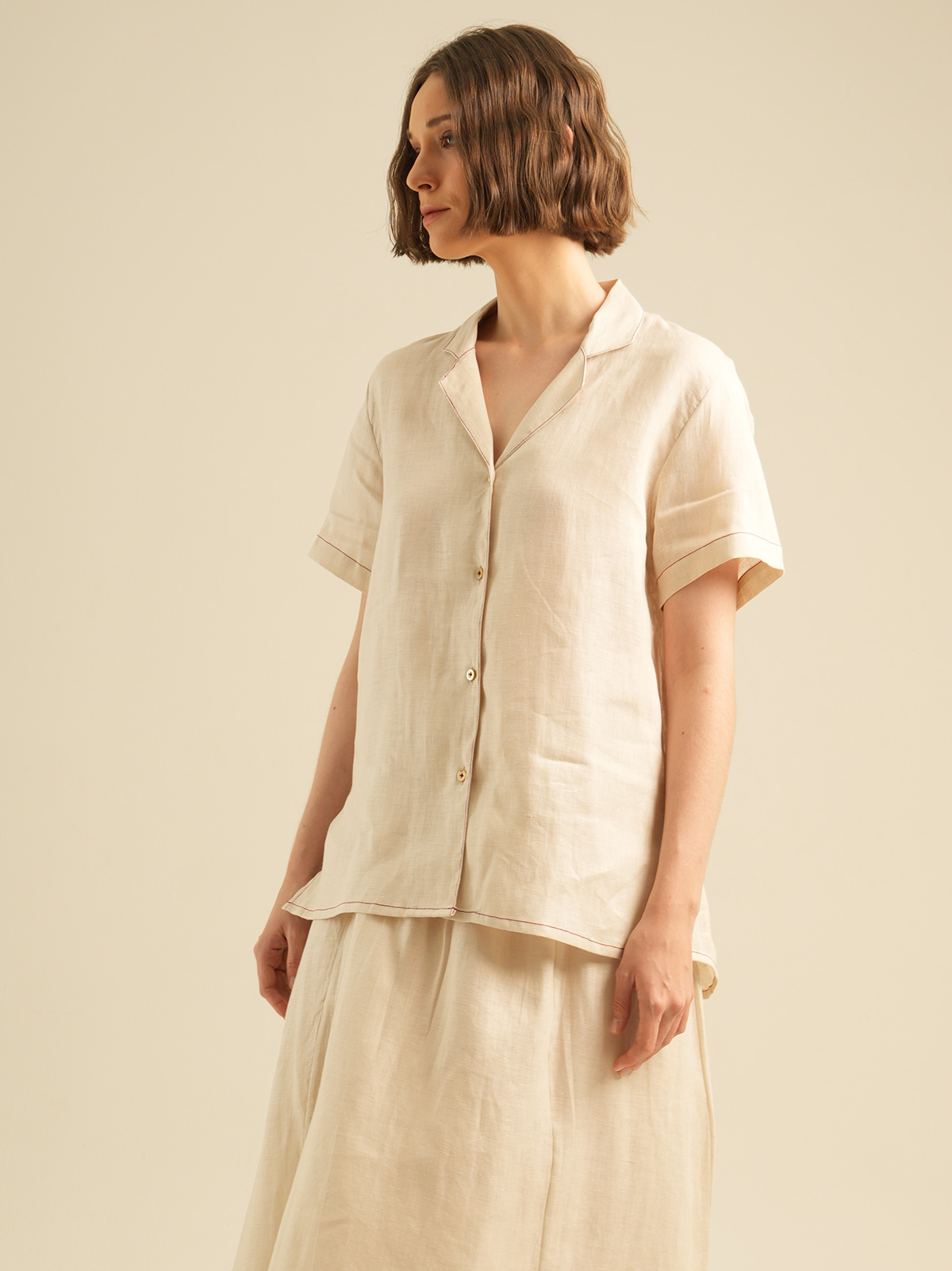 Relaxed Short Sleeves Shirt with Detailed Stitches. Made of 100% Premium Linen