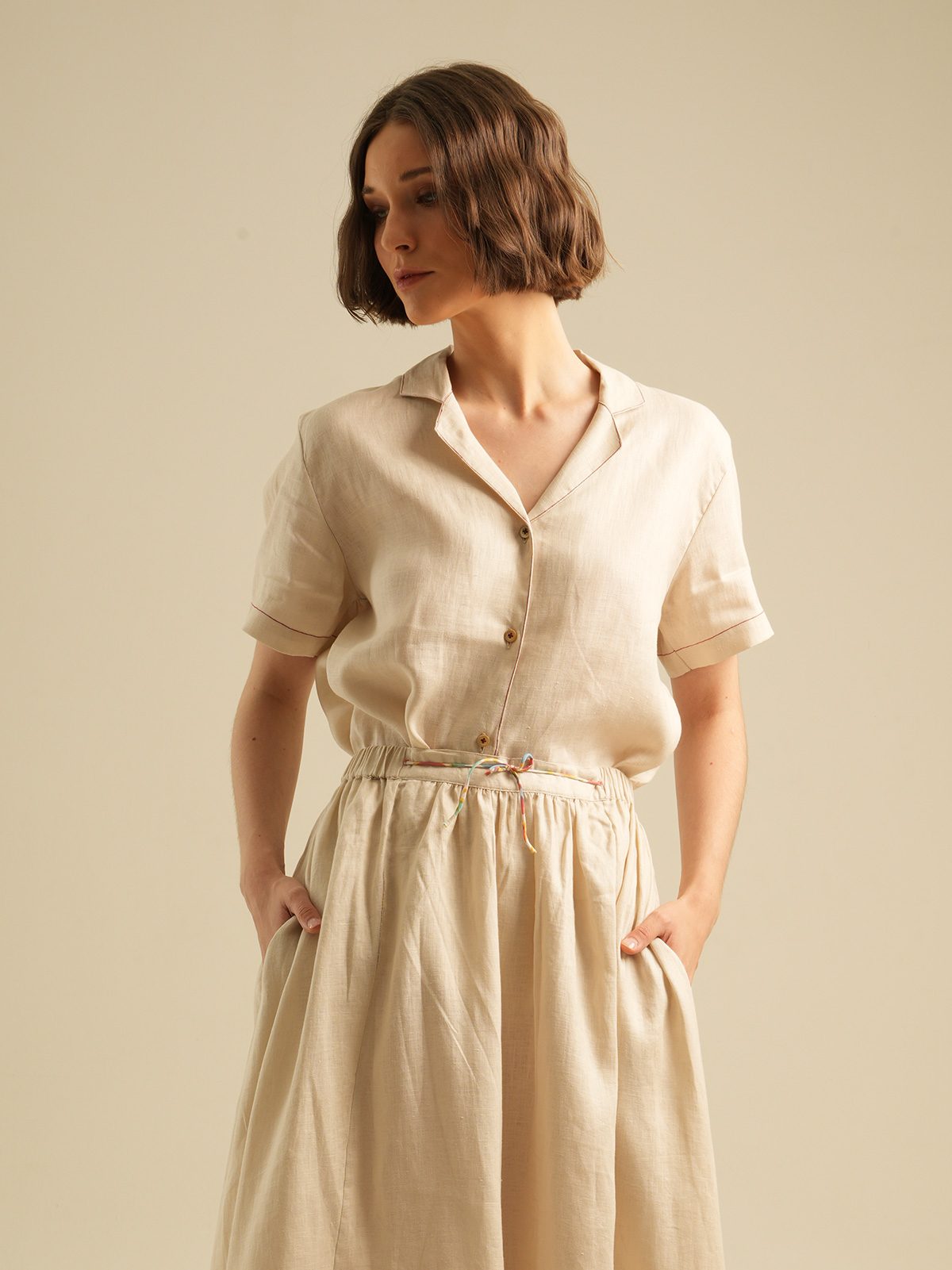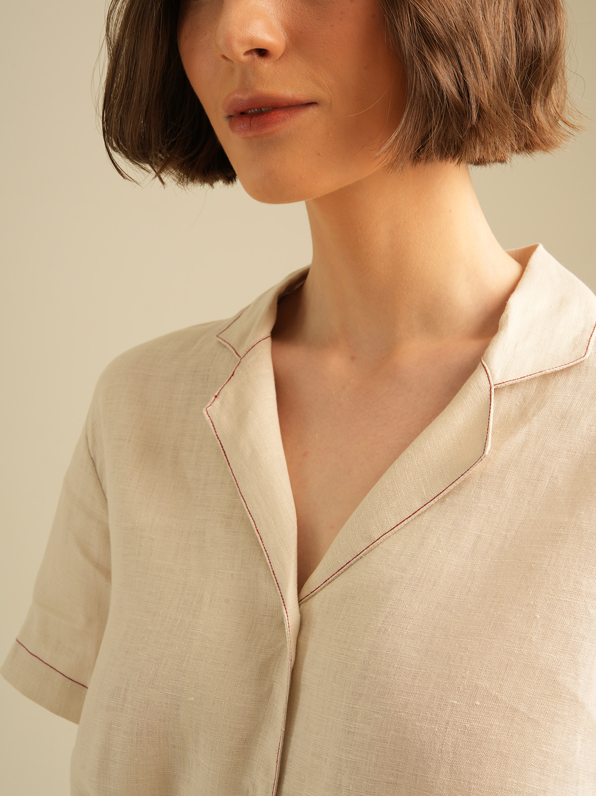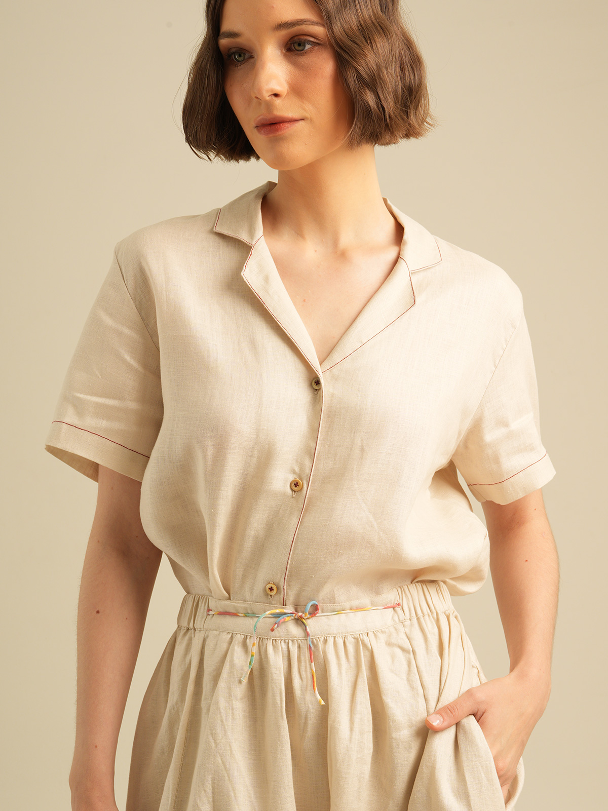 Relaxed Short Sleeves Shirt with Detailed Stitches. Made of 100% Premium Linen
